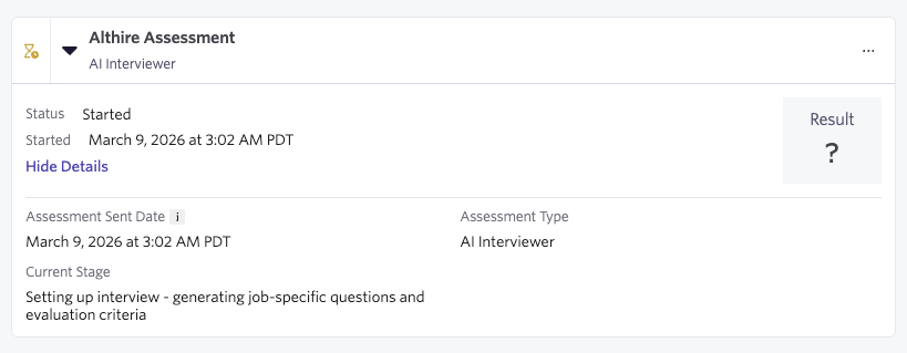 When a candidate reaches the assessment stage in your pipeline, click Start to trigger the assessment.